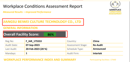 祝賀江蘇百威文化科技有限公司2023年快速通過ITS-WCA驗廠