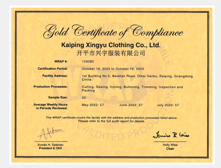 恭賀開平市興宇服裝有限公司2022年通過WRAP驗廠